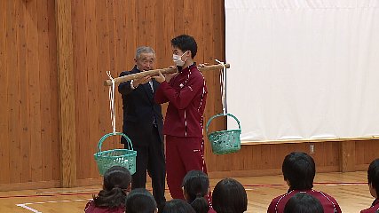 持続可能な地域社会をつくる教育、ESD出前授業が先週金曜日(16日)、遠野中学校で3年生を対象に開かれました。現在、世界には、環境、貧困、人権、平和などといった地球規模での課題が数多くあると言われています。先週金曜日に遠野中学校の3年生128人を対象に開かれたESD出前授業は、持続可能な地域社会をつくるため、地球規模の課題を自らの問題として捉え、一人一人が自分にできることを考えながら、実践していく力を育んでもらおうと、遠野ユネスコ協会がおととしから市内の小中学校で開いています。この日は、遠野ユネスコ協会の藤井洋治さんが講師を務め、スライドと模造紙を使いながら、フィリピンやエクアドルのバナナ農場で働く子どもたちの問題について説明していました。その中でも賃金について藤井さんは、岩手県の最低賃金が738円となっている中、フィリピンのバナナ農場で働く子どもたちの賃金は、一日、500円以下であること。そして、エクアドルに至っては一日、50円となっていて、世界に目を向けると賃金の格差が広がっていることなどを問題として提起していました。さらに授業では、バナナ農場での作業を体験してもらおうと、両端に重量物をぶら下げ、肩に担いで運搬する天秤棒も用意され、3人の生徒たちは、実際に天秤棒を担ぎながら子どもたちの作業の大変さを体感していました。また、出前授業では、遠野ユネスコ協会の遠山豊会長から、書き損じはがきを回収し得た資金で途上国の教育環境を支援する世界寺子屋運動の紹介もあり、生徒たちに協力を呼びかけていました。この日のESD出前授業を通じて生徒たちは、地球規模でのさまざまな問題に対し、今、自分たちができることは何か、気づきを得ていた様子でした。なお、遠野ユネスコ協会では、来年度、遠野東中学校と遠野西中学校でESD出前授業を予定しています。Copyright(C) TonoCableTelevision. All rights reserved.