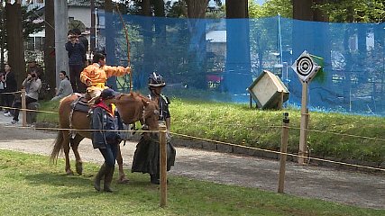 こどもの日の先週土曜日(5日)遠野郷八幡宮でこども流鏑馬の体験会や大会などが開かれました。遠野郷八幡宮では、子どもたちの健やかな成長を願い、毎年こどもの日に合わせてこども流鏑馬が行われていてことしで27回目になります。また、より多くの人に流鏑馬を楽しんでもらおうと、ことしは、こども流鏑馬の体験会も開かれ、参加した子どもたちは、弓を引く練習をした後、実際に馬に乗り的をめがけて弓を引いていました。この後、こども流鏑馬大会が開かれ、市内外の小学1年生から中学2年生までの21人が、射手奉行として参加しました。こども流鏑馬は、ポニーに乗って100mほどの馬場に20m間隔で設置された3つの的をめがけて合計6回矢を放ちます。烏帽子をかぶり侍装束に身を包んだ子どもたちは、真剣な表情で弓を引き練習の成果を披露しました。今回は、中学2年生の荒矢明斗君と小学5年生の菊池壮悟君の2人が、見事、6射全てを的中させました。また、こども流鏑馬大会終了後には、市内外から14人の選手が参加し、競技流鏑馬大会が開かれました。訪れた人たちは、かわいらしい子どもたちの流鏑馬と迫力ある競技流鏑馬それぞれの魅力を感じている様子でした。Copyright(C) TonoCableTelevision. All rights reserved.