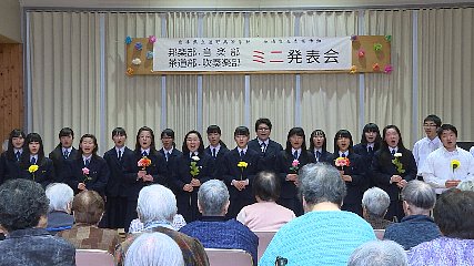遠野高校の文化部の生徒たちが、先週土曜日(19日)健康福祉の里を訪れ、地域の人たちに合唱などをプレゼントしました。遠野高校の文化部は、震災後、被災者支援や地域の高齢者との交流の場として、毎年、ミニ発表会を開いています。この日は、ふれあいホーム薬研淵と通所介護事業所同心館の利用者およそ50人と交流を深めました。発表会の前には、茶道部の生徒たちが、お茶とお菓子で集まった人たちをもてなしました。ミニ発表会では、初めに、生徒会執行部の生徒たちがプロジェクターを使って自分たちの学校を紹介しました。続いて、邦楽部・音楽部・吹奏楽部の生徒たちが、琴やフルートの音色と合唱を会場いっぱいに響かせ、集まった人たちは、リズムをとったり、歌を口ずさんだりしながら楽しんでいました。最後に、ふるさとを全員で歌い、会場全体が一つとなっていました。アンコールが送られると、高校生たちが、おじいちゃん・おばあちゃんのそばに寄り添いながら一緒に歌い、歌い終わると「ありがとう」の言葉と握手を交わしていました。このミニ発表会は、冬にも開かれる予定ということです。Copyright(C) TonoCableTelevision. All rights reserved.