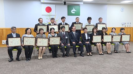 遠野市職員の勤続功労者に対する表彰式が、おととい(25日・火曜日)市役所本庁舎で行われました。この表彰は、30年以上市の発展や振興に貢献した市職員と、教育現場において長年尽力したとして教職員に対し行われました。初めに、本田市長から表彰の対象となった10人の市職員に表彰状が贈られました。続いて、中浜教育長から5人の教職員に表彰状が贈られました。式の最後には、本田市長が受賞者のこれまでの労をねぎらいながら、「遠野の人づくり、健康づくり、地域づくりなどで、これからもそれぞれの立場から役割を果たして頂きたい」と伝えていました。Copyright(C) TonoCableTelevision. All rights reserved.