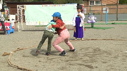 ここで、園児力士たちの元気いっぱいの取り組みをお伝えします。「しらいわっこげんきすもうたいかい秋場所」は、女の子と河童が相撲をとる絵本を見た園児たちが相撲に興味を持ったことをきっかけに、ことし6月の春場所に続いて開催されました。きょうは、3才から5才までの園児力士たちが綱引きの縄を使って園庭に作られた土俵で相撲をとりました。また、園児力士によるがんばりの様子は、園児が扮する白岩保育園放送協会のカメラマンがしっかりと記録していました。秋晴れのもとでの相撲大会。白岩保育園の園庭には、これから寒くなる季節に負けないぐらいの元気いっぱいな園児力士たちの声が響き渡っていました。Copyright(C) TonoCableTelevision. All rights reserved.