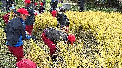青笹小学校の児童たちがおととい(23日・火曜日)、地元の田んぼで稲刈りを体験しました。この日、稲刈りを体験したのは、青笹小の5年生17人です。児童たちは、社会科の授業の一環として米づくりの大変さや収穫する喜び、農家の思いなどを学習しています。ことし5月に児童たちは、学校近くにある17アールの田んぼに「ひとめぼれ」の苗を手作業で植える体験をしました。そして、その時に植えた苗が収穫の時期を迎え、今度は、鎌を使っての稲刈り体験です。ほとんどの児童たちは、鎌を使っての稲刈りは初めてということでしたが、作業に入ると、どの児童も初めてを感じさせないほど手際良く稲を刈っていました。また、この日は、コンバインを使った稲刈りも体験し、運転席に座った児童たちは、真剣な表情でハンドルを操作していました。5月の田植えに続いて今回の稲刈りも身を持って体験した児童たちは、米づくりの大変さや収穫する喜びを感じた様子でした。なお、この日、児童たちによって刈り取られた米は、市内の酒造会社で特別純米酒の原料として使用されるということです。Copyright(C) TonoCableTelevision. All rights reserved.