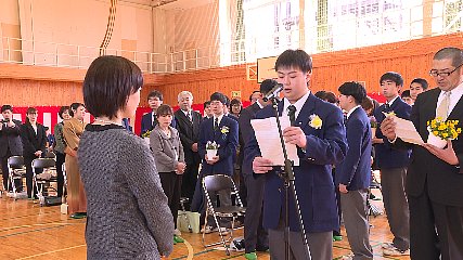 遠野高校に続き、先週土曜日(2日)緑峰高校で卒業式が行われました。式では、在校生たちからの温かなメッセージが添えられた、パンジーとビオラの寄せ植えが花道を彩る中、生産技術科32人、情報処理科18人のあわせて50人の卒業生が入場しました。緑峰高校では、卒業生それぞれが自ら紙を漉き、ホップ和紙で卒業証書を作っていて、柔らかな風合いの世界に一つしかないホップ和紙卒業証書が、一人一人に手渡されました。式辞で、菊池勇校長が、「振り返れば、流した汗や涙が、今の自分を形作るかけがえのない宝物になっているはずです。この宝物を胸に、自信を持って、新たなステージに向かって下さい」と、卒業生たちを激励しました。続いて、在校生を代表して岩間瑞季さんが送辞を述べた後、卒業生を代表して菊池晃広君が答辞を述べました。最後に、卒業生を代表して中村真碧君が、両親に感謝の気持ちを伝えたあと、卒業生一人一人がこれまで育ててくれた親に感謝の気持ちを込めて去年9月に種を蒔き、育ててきたパンジーとビオラの寄せ植えを贈りました。卒業生たちは、高校で仲間たちと過ごした日々を振り返りながら、これからの夢や目標を胸に、3年間過ごした学舎を巣立っていきました。なお、卒業生の進路については、就職36人、進学14人で、100%ということです。Copyright(C) TonoCableTelevision. All rights reserved.