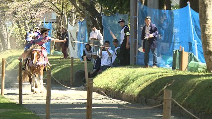 こども流鏑馬終了後には、競技流鏑馬選手による競技流鏑馬大会が開催され、鮮やかに的を射る姿で観客たちを魅了していました。2回目となる競技流鏑馬大会には、市内をはじめ、京都や埼玉など県内外から13人の選手が出場しました。大会は、2組に分かれて行われました。コース上を馬が駆け抜け、乗馬している騎手が、3カ所に的が設置されているコースを3回走り、全部で9つの的を狙います。青空に桜吹雪が舞い、馬や騎手の古式ゆかしい衣装が映える中、人馬一体となってコースを颯爽と駆け抜け矢を放つ勇壮な姿に、会場に集まった人たちからは盛大な拍手が送られていました。大会の結果、青森県三沢市の増田華子さん・中学3年生が、見事すべての矢を的中させて優勝し、ことし10月に十和田市で開催される世界流鏑馬選手権大会への出場権を手にしました。Copyright(C) TonoCableTelevision. All rights reserved.