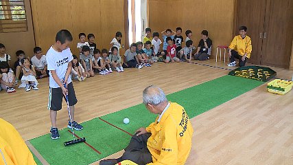 遠野児童館では、誰もが気軽に楽しめるニュースポーツ、「スカットボール」を通じて、児童たちが遠野町15区の60歳以上で構成する大日クラブのメンバーと交流を深めました。遠野児童館では、毎年、運動会の振替休日を利用して、大日クラブのメンバーと世代間交流などを図るイベントを開催しています。きのうは、児童館を利用する1年生から5年生までの児童35人が、大日クラブのメンバー4人と「スカットボール」を楽しみました。「スカットボール」は、スティックを使ってボールを打ち、的となる台の穴にボールを入れて点数を競うニュースポーツです。ほとんどの児童たちは、初体験ということで、初めは思うようにボールを打つことができず悪戦苦闘していましたが、それでも何とかボールが穴に入ると笑顔を見せるなど、夢中でスカットボールに挑戦していました。1年生から5年生までの児童たちが挑戦したスカットボール。得点を競った結果、いずれも2年生の佐々木里桜さんと林泉里さんの2人が優勝しました。なお、遠野児童館では、夏休みにも大日クラブのメンバーとの交流会を予定しているということです。Copyright(C) TonoCableTelevision. All rights reserved.