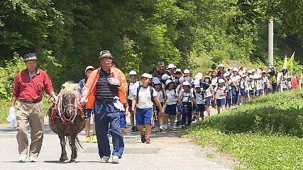 上郷小学校の全校遠足がきょう(21日・金曜日)行われ、児童は、ポニーと一緒に歩き自然を満喫していました。上郷小学校の全校遠足では、児童の絆を深めると共に自然とふれ合ってもらおうと、なでる牧場のポニーと一緒に歩くことが恒例となっています。きょうは、1年生から6年生までの児童68人が、ポニーの「レディー」と一緒に歩き、上郷町の曹源寺を見学したあと、目的地の繋公民館でとん汁を作りました。高学年の児童は、具材を入れる順番などを低学年の児童に優しく教えてあげながら、おいしいとん汁ができるよう一生懸命料理していました。児童たちは「おいしい」と笑みを浮かべながらとん汁をほおばり、料理と自然を満喫している様子でした。Copyright(C) TonoCableTelevision. All rights reserved.