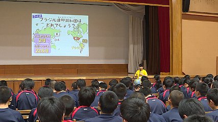 遠野東中学校で、きのう(25日・火曜日)「食」を通じたブラジルと日本とのつながりを考える明治食育セミナーが開かれました。このセミナーは、食品の原材料産地や流通などが国を越えて繋がっていることを知り、国際的な視野に立って文化と課題について中学生たちに考えてもらおうと食育活動に取り組んでいる明治が開きました。来月、パラリンピック競技5人制サッカーブラジル代表が事前合宿で遠野を訪れるのを前に、ブラジルの食文化などについて理解を深めます。きのうは、明治北日本支社コミュニケーション課食育担当の細川里奈さんが講師を務める中、全校生徒164人が参加しました。初めに、ブラジルの面積や言語について学びました。日本のちょうど反対側にあるブラジル連邦共和国の面積は、およそ851・2万平方キロメートルで、日本のおよそ22・5倍。人口は、およそ2億784万人で、日本のおよそ2倍ということです。続いて、ブラジルの食べ物について、日本との共通点や違いを学びました。ブラジルの主な農産物の一つである「カカオ」について理解を深めたあとは、実際にブラジルのカカオを使用して作られているチョコレートを試食しました。生徒たちは、チョコレートの香りや甘み・酸味などを確かめるように少しずつ口に運び、ブラジル産カカオについて“おいしく”学習していました。セミナー終了後には、生徒たちが講師の先生たちに感謝の気持ちを込めて合唱をプレゼントし、透き通った歌声に目を潤ませていました。なお、パラリンピック競技5人制サッカーブラジル代表は、来週木曜日(7月4日)に遠野に到着し、滞在中には、歓迎交流会やパラスポーツ体験会、市内中学校での交流などが予定されています。Copyright(C) TonoCableTelevision. All rights reserved.