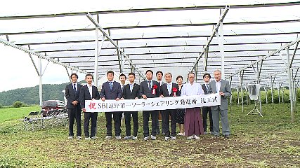 エネルギー事業を手掛ける東京の会社が青笹町に整備を進めていた農業と太陽光発電を同時に行うソーラーシェアリング発電所が完成し、先週金曜日(23日)、竣工式が執り行われました。ソーラーシェアリング、営農型太陽光発電は、農業を行いながら農地の上で太陽光発電をする仕組みのことで、農業と発電による収入が見込めるため、耕作放棄地や後継者問題の解消などを解決する取り組みとして注目されています。青笹町中沢に完成したソーラーシェアリング発電所は、太陽光や風力など自然エネルギー事業を手掛ける東京のSBIエナジーが、総事業費およそ3億1千万円をかけて、およそ1.9ヘクタールの耕作放棄地に整備しました。また、年間の発電量は、およそ316世帯分の消費電力に相当するおよそ139万1千キロワットで、すでにことし6月から東北電力の個別価格買取制度を利用して、売電が始まっているということです。先週金曜日、現地では、ソーラーシェアリング発電所の完成を祝おうと関係者が出席して、竣工式が執り行われました。発電所を整備したSBIエナジーの中塚一宏代表取締役社長が「太陽光発電所があることでその収益が農業に従事する人たちに還元できる仕組みとなるよう頑張っていきたい」とあいさつ。続いて、発電所が整備された農地で来月から本格的に畑わさびの栽培に取り組む、紫波町の農業法人オービットファームの佐藤大実職務執行者が、「地域のみなさんの力を借りながら、青笹町から新しい農業のモデルを全国に発信していきたい」とあいさつし、営農への意欲を見せていました。なお、SBIエナジーとオービットファームでは、今後、発電所で栽培された畑わさびは、市内の加工所に出荷するほか、災害時には地域の防災拠点として、発電所の電力を活用できるよう非常用電源設備の整備も進め、遠野の地域活性化のため取り組んでいくとしています。Copyright(C) TonoCableTelevision. All rights reserved.