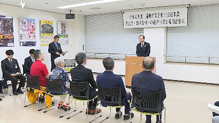 遠野市の友好都市である熊本県菊池市と宮崎県西米良村を訪問する遠野市民交流団がきのう(2日・水曜日)とぴあ庁舎で出発式を行いました。菊池市と西米良村への訪問は友好都市の歴史や文化・自然に触れながら、地域の人たちと交流を深め郷土である「遠野」を見つめ直す機会としておよそ20年前の平成12年から毎年実施されています。市民交流団は、今回の訪問の目玉である菊池市民劇を鑑賞しようと、遠野物語ファンタジー制作委員会をはじめ遠野市区長連絡協議会や遠野ときめら会から5人が参加します。出発式で、市民交流団の菅原伴耕団長が「菊池市の市民劇を鑑賞することを楽しみにしています。また、遠野と通ずる部分がある西米良村の山村地域の取り組みなど、交流をしながら精一杯学んできたい」とあいさつしました。次に、各団員の自己紹介と抱負が述べられた後、本田市長から菅原団長に菊池市の江頭実市長と西米良村の黒木定藏村長へのメッセージが手渡されました。本田市長は、「菊池市の市民劇や西米良村の伝統芸能など、交流を通じさまざまな学ぶ点があると思います。忙しい日程ではありますが市民を代表し大いに交流してきてください」と、激励の言葉を送りました。なお、市民交流団は、今週土曜日(5日)に出発し3泊4日の日程で菊池市と西米良村を訪問するということです。Copyright(C) TonoCableTelevision. All rights reserved.
