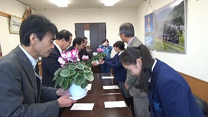 遠野市内の企業が先月、高校生が育てた花を買い上げ、遠野市に贈りました。その様子が届きましたのでお伝えします。市に花を贈ったのは、車検整備などを行う松崎町の駒形モータースです。この日、駒形モータースの佐々木精太郎代表取締役会長がとぴあ庁舎を訪れ、緑峰高校の生徒たちが育てたシクラメン110鉢を買い上げ市民の観賞用にと市に贈りました。本田市長は、7回目の市への寄付に感謝するとともに同席した緑峰高校の生徒たちの今後のさらなる活躍に期待していました。なお、贈られたシクラメンは早速、市内の保育施設や東舘町の元気わらすっこセンターで飾られているということです。Copyright(C) TonoCableTelevision. All rights reserved.