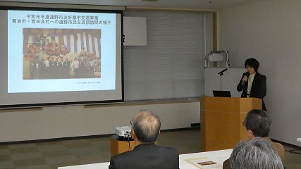 ことし10月に遠野市の友好都市である熊本県菊池市と宮崎県西米良村を訪問した市民交流団の報告会の様子が届きましたのでお伝えします。菊池市と西米良村への訪問は、お互いの市や村の歴史や文化、自然に触れながら交流を深め、郷土「遠野」を見つめ直す機会にしようと平成11年度から毎年実施されています。今年度は、遠野物語ファンタジー制作委員会や遠野市区長連絡協議会から参加した市民5人が、ことし10月5日から8日までの3泊4日の日程で菊池市と西米良村を訪問しました。滞在中、一行は今回の訪問の目玉である菊池市民劇の鑑賞をはじめ、菊池神社やメロンドーム、おがわ作小屋村などの視察を行いながら菊池市と西米良村の人たちと交流を深めてきたということです。先月26日に開かれた報告会では、市や関係団体の代表者などが集まる中、市民交流団の団員5人がそれぞれ、菊池市と西米良村を訪れた際の感想を発表しました。団員からは、「菊池市民劇を鑑賞し遠野物語ファンタジーの立ち上げ時を推測させてくれた」、「短期間の練習と舞台構成、ストーリーの運びは遠野も参考に出来るのでは」といった感想や「遠野市民はこの交流事業への関心が低いように感じる。菊池市と西米良村の交流の取り組みなどを積極的に発信し、関心を高めていくような工夫が必要」といった意見も出されていたということです。また、報告を受けた本田市長などは「交流団での経験を市民にお知らせしながら今後のまちづくりに生かしてほしい」と交流団に労いの言葉が掛けられていたということです。なお、来年2月22日から24日まで今度は、菊池市と西米良村からの交流団が遠野を訪れ、遠野物語ファンタジーの鑑賞などで交流を深める予定です。Copyright(C) TonoCableTelevision. All rights reserved.