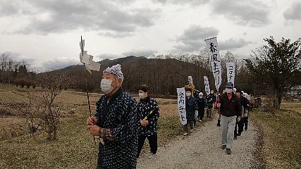 さて、昔ながらの遠野の年中行事をお伝えしましょう。遠野ふるさと村で今週日曜日(29日)に行われた「春風祭り」の様子をご覧ください。春の風を呼び込み、豊年万作や家内安全などを祈願する「春風祭り」。昔ながらの遠野の年中行事として、遠野ふるさと村で毎年伝承活動が行われています。遠野ふるさと村で伝承活動に取り組む早池峰の会のメンバーは、願いを書いた旗や手作りのわら人形をもって練り歩き、村内にまつられている神様に奉納しました。ことしは、豊作や家内安全などの他にコロナ退散の旗も用意され、少しでも早い収束を願っていました。Copyright(C) TonoCableTelevision. All rights reserved.
