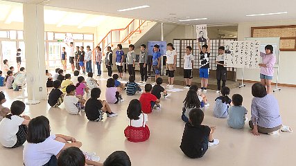 遠野物語の地元にある土淵小学校で、先週金曜日(12日)、遠野物語の日集会が開かれ、児童たちが、楽しみながら、遠野物語についての理解を深めました。「遠野物語」は、明治43年6月14日に発刊され、きのう(14日・日曜日)で110周年となりました。遠野物語の話者・佐々木喜善は土淵の出身であることから、地元・土淵小学校の児童たちは、総合的な学習の時間で遠野物語について学びを深めています。発刊から110周年のことし、土淵小学校で初めて、6月14日の「遠野物語の日」を前に、「遠野物語の日集会」が開かれました。佐々木哲也校長が「きょうは、6年生が、遠野物語について教えてくれます。1・2年生は、聞く・見る・楽しむ。3・4年生は、遠野物語のことを知る。5・6年生は、遠野物語をどう伝えていきたいか、これからのことを考えてください」とあいさつしたあと、6年生の発表です。6年生は、下級生たちにも分かりやすいように、質問を投げかけたり、イラストを見せたりながら、工夫を凝らして堂々と発表していました。6年生の発表、とても立派でしたね。「地元・土淵に住む児童たちだからこそできること」をたくさん見つけていってほしいですね。続いて、全校児童で「遠野物語かるた」遊びをしました。児童たちが札を手にすると、遠野市の学芸員・前川さおりさんが、札に描かれている「雪女」「オシラサマ」などについて分かりやすく説明し、低学年の児童たちも、遊びの中から遠野物語についてしっかりと学んでいました。最後に、前川さんは「皆さんが『生きた遠野物語』です。これからも遠野物語のことを忘れないで、大事にしていってください」と、児童たちに語りかけていました。土淵小学校では、子ども語り部の活動にも力をいれていて、佐々木校長は「受け継がれてきた文化・地域との繋がりを大切にする中で、地域活性化、そして、子どもたちの表現力の向上に繋げていきたい。また来年も、遠野物語の日集会を開けたら」と、次の世代を担う子どもたちが遠野物語を後世に受け継いでいってくれるよう、未来に思いをはせていました。Copyright(C) TonoCableTelevision. All rights reserved.
