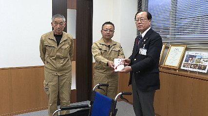 花巻市の企業が、公共施設などで役立ててほしいと今週月曜日遠野市に車いすを贈りました。とぴあ庁舎を訪れたのは、花巻市で遺品整理や特殊清掃などを行っている「サポートサービス彩棟」の斎藤伸一代表と佐々木久幸さんです。斎藤代表は、十数年前から宮守町に住むようになり、遠野市に何か貢献したいという思いから市に車いす1台を贈りました。贈られた車いすは、空気漏れやパンクの心配が無いと言われる「ハイポリマータイヤ」というタイヤが使われているということです。本田市長は、「遠野市は現在、思いやりのある優しいまちづくりに取り組んでいる。障がい者や高齢者のためにしっかり活用させていただきます」と感謝を述べていました。なお、贈られた車いすは、健康福祉の里で使用されるということです。Copyright(C) TonoCableTelevision. All rights reserved.