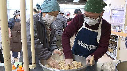 千葉家の活用を考える会による手前味噌づくりが、先週火曜日(2月23日)綾織地区センターで行われました。重文千葉家の活用を考える会では、地域の活性化に向けて綾織町の重要文化財・千葉家住宅の家財道具を活用したイベントや学習会などを開いています。この中で、資料や記録を参考にした伝統的な料理づくりにも取り組んでおり、味噌を作った記録が千葉家に残っていたことから、考える会のメンバーが味噌づくりに挑戦しました。初めに、煮た大豆を袋に入れ、足で踏んで潰します。また、千葉家に残っていた「半切」と呼ばれる底の浅い桶も使われ、集まった人たちは、かつて千葉家の人も同じように使っていたのかと思いを馳せながら、粒が残らないようしっかりと足踏みをしていました。そして、ペースト状になった大豆に塩と麹を加えてよく混ぜた後、中に空気が入らないよう保存容器に投げ入れて仕込みは完了です。なお、仕込んだ味噌は、千葉家の石蔵で1年ほど寝かせたあと、参加者で分け合うということです。Copyright(C) TonoCableTelevision. All rights reserved.