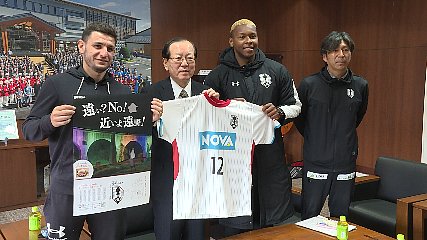 遠野出身でいわてグルージャ盛岡の菊池利三ゼネラルマネジャーなどが今週火曜日市役所本庁舎を訪れ、今シーズンの活躍を誓いました。本庁舎を訪れたのは、いわてグルージャ盛岡の菊池利三ゼネラルマネジャーのほか、ブラジル出身のモレラト選手とブレンネル選手です。今シーズンのJ3リーグは、先週14日に開幕しいわてグルージャ盛岡は、序盤2試合で1勝1分けと好調なスタートを切っています。菊池ゼネラルマネジャーは、「主力メンバーに加え、新しい戦力となる人も増えて、ことしはチャンスと考えている。J3優勝・J2昇格を目標にがんばっていきたい」と意気込みを述べました。このあと、いわてグルージャ盛岡でことし初めて作ったという県内33市町村を紹介するポスターなどが贈られました。本田市長は、「着実に実績をあげているようなので、今シーズンのさらなる活躍を楽しみにしています」と期待を寄せていました。なお、いわてグルージャ盛岡は、来週日曜日盛岡市のいわぎんスタジアムでAC長野パルセイロとホーム開幕戦に臨むということです。Copyright(C) TonoCableTelevision. All rights reserved.