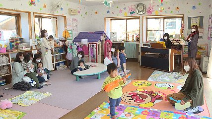 松崎町にある「子育て支援センターまなざし」では、音楽やリズム遊びを親子で一緒に楽しんでもらおうと毎月1回「まなざし音楽会」を開いています。きょうは、入室前の手指消毒や窓を開けて換気するといった新型コロナウイルス感染症対策が取られる中、今年度1回目のまなざし音楽会が開かれました。音楽会では、市内で音楽活動を行っている、ピアノ奏者の新田ちよさんとヴァイオリン奏者の伊禮しおりさんが童謡やポーズをまねする遊びを交えた曲などを演奏しました。集まった親子は、歌に合わせて手拍子をしたり鈴やタンバリンなどを鳴らしたりしながら、音楽の楽しさに触れていました。なお、子育て支援センターまなざしでは、音楽会や絵本の読み聞かせを定期的に実施しているほか、育児相談なども行っているということです。