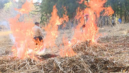 重文千葉家の活用を考える茅場火入れ体験が先週(24日・土曜日)綾織町で行われました。遠野かやぶき保存協会が管理している綾織町の「遠野茅場」は、千葉家の屋根の材料となる茅を育成しています。ここでは、安定して供給できる面積があり、品質が良好ということから、5年前に、文化庁の「ふるさと文化財の森」に設定されました。茅場では、良質な茅が育つ環境を作るために毎年火入れを行っています。ことしは新型コロナウイルス感染症対策として、重文千葉家の活用を考える会のメンバーや地元消防団など人数制限をして火入れ体験が実施されました。この日は、朝6時から作業が始まり、重文千葉家の活用を考える会のメンバーなどおよそ20人が、山火事を起こさないように、細心の注意を払いながら茅を刈ったり、集めた茅に火入れをしてまわったりと、作業に汗を流していました。火を入れることで茅の株が発達するのを防ぎ、根元が曲がっていないまっすぐな茅が育ち、今後、千葉家住宅に品質良好な茅が活用されることが期待されます。なお、千葉家住宅は今年度、馬屋の組立工事や大工小屋の石垣工事を進めて、7年後グランドオープンの予定となっています。