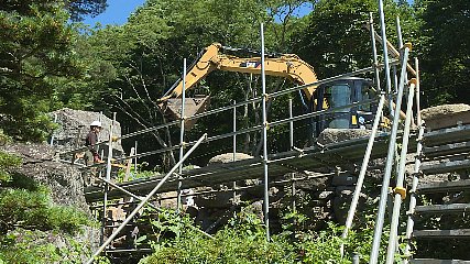 6年目を迎えた綾織町の重要文化財千葉家住宅の保存修理工事。今年度は、大工小屋や稲荷社の石垣工事などが行われています。遠野市では国の重要文化財千葉家住宅を、今後も保存・活用していくために平成28年度から保存修理工事を進めています。今年度は、大工小屋の基礎工事や曲り家の耐震補強・馬屋部分の工事などが進められる予定です。今週火曜日、大工小屋の石垣工事が行われ、工事業者がゆがみや形を整えた石を積み直していました。なお、千葉家の保存修理工事は令和9年度まで行われる予定で、令和10年度にはグランドオープンするということです。