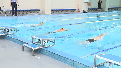 遠野市内小学校水泳記録会がきょう(27日・火曜日)2年ぶりに市民プールで開かれました。遠野市内小学校水泳記録会は、日頃の練習の成果と参加する児童同士の親睦を深めようと、遠野市小学校体育協会が開催しました。ことしは、新型コロナウイルス感染症予防対策として出場を6年生のみとしたほか、プールサイドで待機する児童を次の種目に出場する児童のみとするなど、コロナ禍の中でマナーを守りながら行われました。そうした中、記録会では、一部、競技数を減らしバタフライや平泳ぎなど8種目が行われました。出場した児童たちは学校を代表して臨むという意識を持ちながら、これまで練習した成果を存分に発揮しようと一生懸命泳いでいました。
