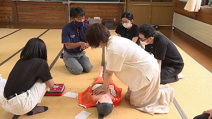 救命講習会がおととい土淵町の遠野みらい創りカレッジで開かれました。この講習会は、子どもの救命救急について理解を深めようと遠野みらい創りカレッジが関係機関に呼びかけ、実施されました。講習会には、子ども向けの事業に取り組む機会が多い、遠野みらい創りカレッジ・遠野市教育文化振興財団・遠野市の職員が参加しました。初めに、体の小さい子どもと赤ちゃんの心臓マッサージの方法やAEDの使い方について消防職員から学び、実践しました。また、新型コロナウイルスの感染拡大を防ぐため、口元をハンカチなどで覆ってから心臓マッサージを行ってほしいという話もありました。このほか熱中症対策や熱中症になった場合の対処法についても説明を受けました。参加した人は、のどに異物がつまったときの対処法や水辺でのAEDの使用などについても質問し、あらゆる場面に対応できるよう知識を深めていました。