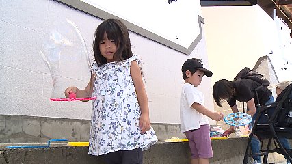 中央通りのこども本の森遠野で、先週木曜日(8月26日)訪れた親子連れがシャボン玉遊びを楽しんでいました。こども本の森遠野は、さまざまな人や本が集まり、新しいものをつくりだす「創造力」と現実にはないことを思い描く「想像力」を育む場として、世界的建築家の安藤忠雄さんが遠野市に贈った文化施設です。7月25日にオープンしてからの来場者数は、先月29日現在、3103人で、その内のおよそ6割は、市外から訪れた人ということです。先週木曜日(8月26日)、こども本の森遠野をより身近にもっと親しみを持ってもらおうとシャボン玉を飛ばすイベントが開催されました。この日は、市内から訪れた4組の親子連れが大きなシャボン玉を飛ばしたり水遊びをしたりして、思い思いに親子で楽しんでいました。なお、こども本の森遠野では、来週11日・土曜日に本の森ミニツアー&シアターが企画されているほか、今後も子育て世代を応援するイベントを開催していくということです。