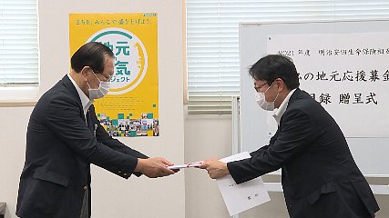 盛岡市内にある生命保険会社が、地域住民の健康増進などに役立ててほしいと先週金曜日(3日)市に寄付金を贈りました。とぴあ庁舎を訪れたのは、明治安田生命保険盛岡支社の横山幸司支社長など5人です。この生命保険会社では、新型コロナウイルスの影響を受けている地域社会を応援するため、「私の地元応援募金」として全国の自治体や団体などに寄付をしています。そうした中、地域住民の健康増進などに役立ててほしいと、横山支社長が寄付金71万4000円を本田市長に手渡しました。受け取った本田市長は、「命と健康は何にも代え難い大事なもの。みなさんのその心をしっかり受け止め、対応していきたい」と感謝を伝えていました。なお、この寄付金は、健康増進のほか、介護・認知症対策や子育て支援に活用されるということです。