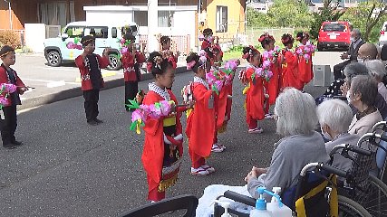 遠野保育園の園児たちが南部ばやしを披露した様子が届きましたのでお伝えします。遠野保育園の5歳児は、遠野の郷土芸能「南部ばやし」に取り組んでいます。そうした中、ことしも南部ばやしを披露する場であった遠野まつりが去年に引き続いて新型コロナウイルス感染症の影響により中止となってしまいました。そこで、一生懸命練習してきた踊りをおじいちゃん、おばあちゃんに見てもらい、少しでもお祭り気分を味わってもらいたいと、材木町にある小規模多機能型居宅介護事業所、長寿庵と、松崎町にある特別養護老人ホーム長寿の郷を訪問し、南部ばやしを披露したということです。園児たちによるかわいらしい踊りにおじいちゃん、おばあちゃんは、南部ばやしを歌ったり踊ったりしながら楽しんでいた様子だったということです。