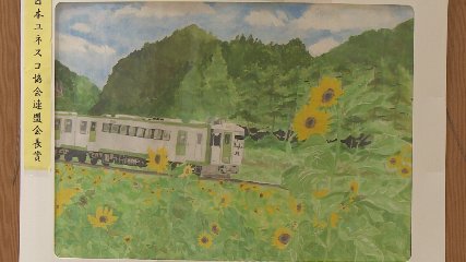 第20回絵で伝えよう!「わたしの町のたからもの」絵画展の表彰がおととい(28日・日曜日)市役所本庁舎で行われました。この絵画展は、遠野の自然や文化・歴史に目を向け、その素晴らしさを再発見する機会を作ろうと遠野ユネスコ協会が毎年、開催しています。今回は、市内の小学1年生から中学3年生までの児童・生徒が描いた作品201点が集まりました。ON(絵画展様子)そうした中、日本ユネスコ協会連盟会長賞に遠野中学校1年の佐々木愛莉さんの作品が選ばれました。佐々木さんの作品は、夏を感じさせる「ひまわり」とその近くを走る「釜石線」が色彩豊かに表現されていることが評価されました。佐々木さんには、遠野ユネスコ協会の新里佳子会長から表彰状と図書カードが贈られました。また、この日は、遠野市長賞や遠野市議会議長賞などの表彰もあり、受賞した23人にそれぞれ、表彰状と図書カードが贈られています。