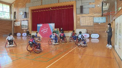 パラアスリートから共生社会などについて学ぶ「あすチャレ!School」がおととい(11月30日・火曜日)綾織小学校で開かれました。あすチャレ!Schoolは、スポーツを通じて共生社会への気づきや学びの機会を児童・生徒に提供しようと、日本財団パラリンピックサポートセンターが全国の小・中・高校で開催しています。この日は、綾織小学校の5年生を対象に開かれ、パラリンピック男子車いすバスケットボール元日本代表の神保康広さんからパラスポーツや共生社会について学びました。デモンストレーションでは、神保さんが、普段使っている車いすと競技用の車いすの違いや操作について説明したあと、実際にドリブルをしたり3ポイントシュートを決めたりしました。神保さんが車いすを自在に操ると児童たちは目を輝かせ、その動きに見入っていました。続いて、児童たちが実際に競技用の車いすに乗って車いすバスケットボールに挑戦しました。児童たちは思ったように進まない車いすに苦戦しながらも、みんなで協力しながらボールを運び、シュートが決まると笑顔を見せていました。そして最後に、神保さんが事故で障がいを負ったことなどを話し、「挑戦すること」「知ること」の大切さについて伝えていました。児童たちは体験と講話を通じて、障がいや共生社会などについて理解を深めている様子でした。