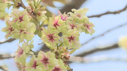 市民センター前では現在、緑色のめずらしい桜が花を咲かせています。市民センター前を流れる来内川、そのほとりでなかなかお目に掛かれない緑色の桜が花を咲かせています。残念ながら、見ごろは過ぎて葉桜となっていましたが、緑色の花びらは気持ちよさそうに風に揺れていました。