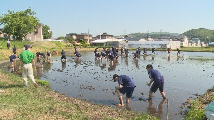 毎年恒例の緑峰高校1年生による田植え実習がきのう(25日・水曜日)学校近くの田んぼで行われました。緑峰高校1年生による田植え実習は、手作業による田植えを体験することで、食料を得ることの大変さを感じ、日本の食農文化に対する理解を深め、農作業の楽しさを仲間と分かち合ってもらおうと毎年、行われています。きのうは、生産技術科と情報処理科の1年生40人が遠野市が生産拡大を進めている「いわてっこ」の苗を手作業で植えました。この苗は、生産技術科の先輩が種まきをした苗で、生徒たちは、田んぼに足を取られ苦戦しながらも楽しそうに苗を植えていました。なお、秋の収穫までの田んぼの管理は、2年生と3年生のが行い、その後、1年生によって収穫されたお米は、秋の緑峰祭で販売されるということです。