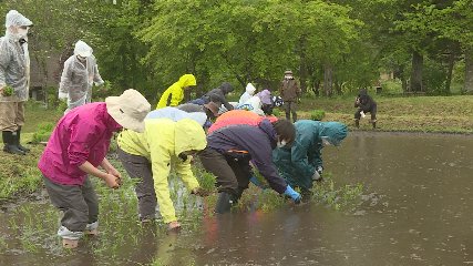 機械を使わず手で苗を植える昔ながらの田植え会がきょう(27日金曜日)ふるさと村で開かれました。この田植え会は、今ではすっかり姿を消してしまった昔ながらの田植えの風景を再現しようとふるさと村が初めて企画しました。きょうは市内から12人が参加し、およそ3アールの水田に白さとコシの強さが特徴的なもち米、ひめのもちの苗を手作業で植えました。あいにくの天気となった中、参加者たちは講師を務めたまぶりっと衆のメンバーから教えてもらいながら楽しそうに苗を植えていました。なお、秋には収穫したもち米を使った収穫祭の開催が予定されているほか、脱穀した稲を活用したわら沓作りなども行われるということです。さらにきょうふるさと村では、生活習慣病の予防や運動不足の解消などを目的とした健幸ウォーキングイベントも開かれました。イベントにはおよそ50人が参加し、豊かな自然を堪能しながらゆっくりとウォーキングを楽しんでいました。