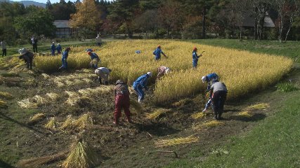 附馬牛小学校の児童が先週金曜日、(14日)遠野ふるさと村の田んぼで稲刈りを体験しました。この稲刈り体験はコロナ禍で途絶えていた地域住民との交流を通じて、先人がどのように稲作をしてきたか学ぶことを目的に取り組まれました。秋晴れとなったこの日は、附馬牛小学校の5・6年生11人が、「まぶりっと」と呼ばれる昔ながらの知恵や技を持つ達人から教わりながら春に植えた「ひめのもち」の稲刈りに挑戦しました。児童たちは鎌の使い方を教えてもらったあと田んぼに入ると、すぐにコツをつかみ、どんどん稲刈りを進めていきました。中には田んぼのぬかるみに足を取られ転びそうになったり泥で服を汚す児童もいたりして、稲刈り体験では、楽しそうな歓声があがっていました。最後に児童たちは、刈り取った稲をはせ掛けし、1年を通して昔ながらの稲作を学び地域住民との交流を楽しんでいた様子でした。