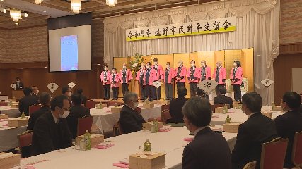 令和5年の遠野市民新年交賀会が先週金曜日(6日)あえりあ遠野で開かれました。この新年交賀会は、市民が集い新春のあいさつを交わし交流を深める場として毎年この時期に開催されていて、ことしは94人が参加しました。ことしも検温や手指消毒のほか飲食中以外はマスクを着用するなど新型コロナウイルス感染症対策が取られる中での開催となりました。初めに、実行委員長を務める多田市長があいさつし、「コロナ禍で自粛した一年だったが子どもたちの活躍が素晴らしかった」と去年を振り返りました。そして、ことしについては、「子どもたちが元気に活躍できるようみんなで応援していかなくてはならない。遠野中みんなの幸せと健康を祈ってきょうお祝いしたい」と述べました。続いて、青笹町で「遠野中平農園」を営む中平知宏代表が新年の抱負を語りました。青笹町出身の中平さんは、農業大学校卒業後、県北の大規模露地野菜生産法人で2年間の研修を経て、令和元年に祖父母の後を継ぎ就農しました。コツコツと地道な土づくりにこだわり、おいしい野菜を消費者に提供していて、農業を子どもたちの憧れる職業にしていきたいと今日も土づくりに精を出しています。更なる飛躍の年の幕開けとして鏡開きが行われたあと、乾杯をしてからは参加者たちが新年のあいさつを交わしながら交流を深めていました。スタジオへアトコメなお、あすから2回に分けまして遠野市民新年交賀会に出席した人たちによる令和5年の抱負をお送りする予定です。