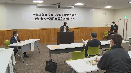新型コロナウイルス感染症の影響により、3年ぶりに友好都市の熊本県菊池市を訪問した遠野市民交流団による報告会がおととい(27日・月曜日)市役所本庁舎で開かれました。遠野市民交流団の団員9人は、今月4日から6日までの2泊3日の日程で、遠野市の友好都市である熊本県菊池市を訪問しました。菊池市では、今回の交流事業の主目的である図書館機能を備えた生涯学習センター「キクロス」の見学をはじめ、菊池一族ゆかりの地や熊本城の復興状況を視察。さらに菊池市の地域における取り組みを学ぶとともに、友好都市としてより一層絆を深めてきました。おととい(27日・月曜日)本庁舎で開かれた報告会には、6人の団員が出席しました。初めに交流団の団長を務めた菊池太一さんが「2泊3日という日程の中、菊池市の皆さんには感謝しきれないほどの歓迎を受けました。今後に繋がる交流事業になったと思います」とあいさつしました。続いて、引率した市の職員から今回の菊池市訪問について報告された後、出席した団員がそれぞれ感想を述べました。この後、感想を聞いた多田市長などは、「皆さんの話を聞いて改めて交流というのは大事なことと思いました。これからも厚い付き合いをいろいろな所としていきたいです」と話し、菊池市を訪問した団員を労っていました。なお、来年度は、遠野市の友好都市である宮崎県西米良村への訪問が予定されています。