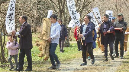 昔ながらの遠野の年中行事、「春風祭り」が今週日曜日(9日)遠野ふるさと村で開催されました。春風祭りは、ことし1年の「五穀豊穣」や「家内安全」、「無病息災」などを祈願するもので、昔ながらの遠野の年中行事として遠野ふるさと村で毎年、伝承活動が行われています。この日は、まぶりっと衆・早池峰の会の会員や観光客などおよそ20人が参加しました。祭りが始まると参加者たちは、手づくりのわら人形をはじめ、「豊年満作」、「疫病退散」など願いが書かれた旗を持って村内にある神社を目指して練り歩きました。そして、神社に着くと参加者たちは、わら人形と旗を奉納した後、お供え物の団子やお菓子を分け合って食べ、ことし1年の無病息災などを祈っていました。なお、遠野ふるさと村では、今後も季節に応じた様々な年中行事を開催していくということです。