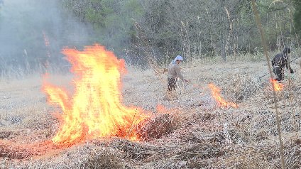 重文千葉家の活用を考える会による春の茅刈り・茅場火入れワークショップが、先週土曜日(22日)から2日間開かれました。重文千葉家の活用を考える会では、文化財を守るために良質な材料が必要なことをみなさんに知ってもらうため、茅刈りと茅場の火入れを体験できるワークショップを企画し一般の参加者を募りました。悪天候で予定から一週間延期しての開催となる中、1日目は、刈り取るはずの茅が強風などの影響で倒れてしまっていたため翌日・2日目に行われる火入れの準備が進められました。会員を中心とした参加者たちは、茅場の周りを土肌が見えるように機械で刈り取り刈り取った茅や草は熊手で内側に寄せて隣の山に火が入らないよう整えていました。また、去年の秋に刈り取られ乾燥させるために島立てされていた茅はトラックの荷台に乗せられ、茅を保管する小屋に運ばれていきました。一方、力仕事をして帰ってくる人たちのために綾織地区センターの調理室では、ひっつみづくりなどが行われていました。ひっつみに合わせて、梅干し入りのおにぎりや和え物、会員が育てた大豆でつくったふっくら柔らかの煮豆、桜湯などを用意して帰りを待ちました。翌日は、早朝からの火入れ作業、参加者は温かい食事をとって1日目の疲れを癒したということです。次のVへそして2日目朝6時から始まった茅場の火入れ作業。火入れをすることで古い茅が焼かれ残った灰はまっすぐで良質な茅を育てるための肥料になります。作業には重文千葉家の活用を考える会のメンバーはもちろん、地域の人たちなどおよそ20人が参加し、山火事にならないよう細心の注意を払いながら茅に火をつけていきました。またこの日は遠野市の取り組みを参考にしようと金ケ崎町から3人が訪れ、火入れの様子を見学していました。参加した人たちは火入れ作業に汗をながしながら、良質な茅が育つようにと願いを込めていました。