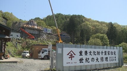 国の重要文化財に指定されている千葉家住宅の第3期保存修理工事が行われている中、先週火曜日(9日)主屋に芝棟が設置されました。遠野市では、国の重要文化財千葉家住宅を今後も保存・活用していくために平成28年度から保存修理工事を進めています。この日の工事では、主屋の茅葺き屋根の棟部分に芝棟が設置されました。芝棟とは、茅葺き屋根の棟からの雨漏りを防ぐための伝統的な技法で、棟の上に土をのせてその土が雨風に流されないように芝や花を植えることで張り巡った根が棟からの雨漏りを防ぐ役割を果たします。職人たちは、木枠をのこぎりで切ったり、芝棟を針金で茅葺き屋根に固定したりして一つ一つ丁寧に作業をしていました。また、この日は、屋根の棟を箱状の板で覆う箱棟も設置されました。なお、重要文化財千葉家住宅の保存修理工事は、令和9年度に完了する予定で進められ、工事の様子については、市ホームページで確認することができます。