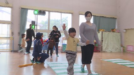 上郷保育園できのう(15日・月曜日)親子交通安全教室が開かれました。この交通安全教室は大切な命を守るために正しい交通ルールを学んでもらおうと、毎年この時期に行われています。きのうは上郷保育園に上郷駐在所の所長と遠野市交通指導隊の隊員が訪れ、3歳から5歳までの園児に歩行者信号の見方や横断歩道の安全な渡り方について教えました。説明の後はホールにしかれた横断歩道のマットや信号機を使って安全に渡るための練習が行われました。園児たちは歩行者信号が「赤」の時だけでなく「青」が点滅している時にも立ち止まることや、右・左・右の順番で車が来ないか確認をすることなど、安全な渡り方を実践していました。また、信号機がない横断歩道の渡り方や傘をさして横断する時は顔が隠れないようにするなどの注意点も話されていました。終わりに上郷駐在所の森岩春雄所長が「きょうはよくできました、これからも道路に飛び出さないように気を付けましょう」と呼びかけていました。