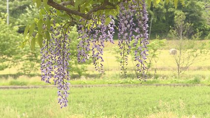 藤の花がことしも咲いたと情報をもらい撮影にいってきました。こちらは、遠野町にある正部家興八さんのお宅で、毎年この時期になると、庭には、樹齢50年ほどにもなる藤の木がキレイに花を咲かせます。例年であれば5月半ば頃に咲く花がことしはなかなか咲かず正武家さんは心配していましたが、最近になってやっと咲いてくれたということです。いつもは棚いっぱいに薄紫色の花が広がっていますが、ことしは霜の影響で4分の1くらいの花付きになりました。それでも、のんびりとキレイな花をつけた藤は、そよ風に揺られるとほのかに甘い香りを漂わせ、初夏の訪れを感じさせていました。