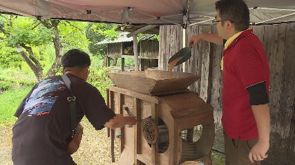 遠野市内で作られた小麦を昔ながらの農具「唐箕」を使って選別する作業の体験会がおととい(16日・日曜日)遠野ふるさと村で開催されました。この体験会は宮守町達曽部の多田農産が進めている遠野市産小麦の生産・普及を推進していくプロジェクトの一環で行われました。小麦作りをする環境として遠野市内は水はけが良い畑が多く風も適度に吹くため適しているそうですが、現在、市内では小規模の生産にとどまっています。この日は去年、1.5ヘクタール作付けした遠野市産小麦の一部およそ160キロを唐箕がけしました。唐箕は明治時代から大正時代にかけて普及した農具で、投入口から稲穂や小麦などを入れると実の部分とワラなどの余分な部分を風の力で選別することができます。体験会で使われた唐箕は普段は遠野ふるさと村で展示されているもので、参加者はハンドルを回して風を起こし小麦の選別作業を行っていました。今後は遠野市産小麦を遠野ふるさと村のレストランや市内の飲食店などで使用してもらえるように働きかけていくということです。