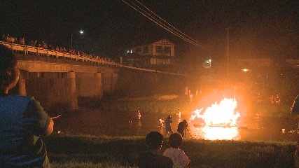 附馬牛町できのう(16日・水曜日)、送り盆の行事舟っこ流しが行われました。舟っこ流しは、お盆に迎えた先祖や故人の霊を送り、無病息災を願う送り盆の行事です。附馬牛町にある徳昌寺では、毎年8月16日に地域の人たちや有志が集まり、舟っこ流しを行っています。午後7時すぎ、初盆を迎えた人たちの位牌を乗せた舟と先祖を供養するための行灯を乗せた2艘の舟が寺を出発し、猿ケ石川へ向かいました。そして、猿ケ石川に運ばれてきた舟に火が点けられると、男衆たちが燃え上がる舟を引き川を下りました。また、川には、初盆を迎えた家族が作ったおよそ200個の灯籠も一緒に流され、川いっぱいに灯籠の明かりが広がりました。集まった人たちは、舟と灯籠を静かに見つめ、夏の終わりを感じている様子でした。