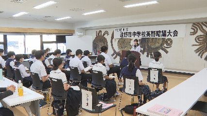 遠野市中学校英語暗誦大会が先週木曜日(31日)、市民センターで開かれました。この大会は、市内中学生の英語力向上と表現力を身につけてもらおうと遠野市教育研究会外国語部会が毎年この時期に開いています。この日は、市内3つの中学校の1年生から3年生までの生徒18人が参加し、普段、授業で使っている教科書の中から引用した英文を発表しました。大会での審査項目は、発音やイントネーションを評価する「音声」、ジェスチャーや顔の表情などをみる「表現」、そして、原稿の暗誦ができているかをみる「暗誦度」の3つです。参加した生徒たちは、少し緊張した面持ちでしたが、自分の出番になると授業や空き時間を利用して練習してきた成果を発揮していました。なお、大会の結果、1年生の部では、遠野西中学校の多田結実さん2年生の部では、遠野西中学校の菊池昇真さん3年生の部では、遠野西中学校の多田颯子さんがそれぞれ1位に選ばれました。