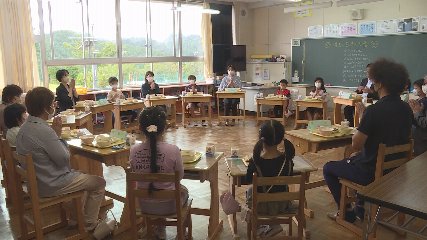 遠野産の食材で作られた給食を子どもたちが給食関係者や生産者と一緒に食べる「交流すまいる給食」がきのう(28日・木曜日)4年ぶりに開催されました。きのう宮守小学校で行われた交流すまいる給食は遠野市内で生産される新鮮で安心安全な食材を使った給食を、給食関係者や生産者と一緒に食べることで地産地消や食育を推進する取り組みです。15年ほど前から毎年続けられてきましたが新型コロナウイルスの影響で中止が続き今回4年ぶりの開催となりました。きのうは給食関係者のほか日々の給食で使われるネギ農家の千葉敏子さんや小友町で和牛の繁殖や肥育を行っている菊池政光さんが招かれ、2年生11人と一緒に給食を食べました。献立は、産直野菜のみそ汁や菊池政光さんが育てた牛の肉を使った、遠野産牛肉丼の具、収穫したばかりの新米などおかずからご飯まで全て遠野産食材で組まれました。児童たちは遠野産の食材だけで作られた給食をじっくりと味わいながら、給食に使われている食材に関することを生産者に聞くなどして交流していました。また、きのうの献立は市内全ての小中学校の給食で提供されています。なお、交流すまいる給食は10月18日に青笹小学校で、11月16日には遠野東中学校で実施される予定です。