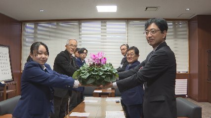 市内の自動車販売業者がきょう(6日水曜日)市にシクラメンの花を贈りました。きょう市役所本庁舎を訪れたのは松崎町にある駒形モータースの佐々木精太郎代表取締役会長と花を生産した緑峰高校生産技術科の3年生2人です。駒形モータースでは、平成22年から寄付を行っており、平成29年からは毎年、緑峰高校の生徒が育てたシクラメンの花を市民の皆さんに鑑賞してもらいたいと市に贈っています。ことしは、緑峰高校から買い取った鉢植え花80鉢が寄付され、きれいに咲いたシクラメンが多田市長に手渡されました。花を受け取った多田市長は、「素晴らしいシクラメンをありがとうございます。大切に育てさせていただきます」と感謝の言葉を伝えていました。なお、寄付されたシクラメンは、市内の保育園や幼稚園などに飾られるということです。Copyright(C) TonoCableTelevision. All rights reserved.