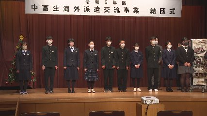令和5年度中高生海外派遣交流事業の結団式が先週の金曜日(22日)あえりあ遠野で開かれました。中高生海外派遣交流事業は、次世代を担う中高生が海外での異文化体験を通じてグローバルな視野と感覚を身につけるとともに国際理解や国際交流への関心を高め国際化に対応できる人材の育成につなげようと、遠野市姉妹都市交流事業実行委員会が実施しています。この事業はコロナ禍による影響で令和2年度から中断していましたが、今年度4年ぶりに再開することとなりました。今回は市内の中高生10人が参加し、令和6年1月5日・金曜日から13日・土曜日までの9日間、遠野市の姉妹都市であるアメリカテネシー州のチャタヌーガ市へ派遣されます。生徒たちはこの派遣に向けことしの8月から全7回の事前研修に取り組み準備を進めてきました。先週金曜日に開かれた結団式には派遣される生徒10人が出席しそれぞれが頑張りたいことや身に付けたいことなどの意気込みを発表しました。意気込みを聞いた多田市長は、「楽しみながらチャレンジして色々なことを吸収してきてください」と激励の言葉を贈っていました。なお生徒たちは、チャタヌーガ市での滞在期間中、市役所の見学や現地の学生との交流を通して日本とアメリカの文化の違いを体験しつつ遠野の魅力を伝えるとしています。Copyright(C) TonoCableTelevision. All rights reserved.