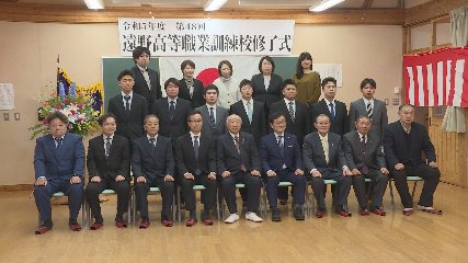 青笹町の遠野高等職業訓練校で先週金曜日(15日)に修了式が行われました。この日、修了式を迎えたのは木造建築科で3年間の訓練課程を終えた高橋錬さん、小沼侃士さん、菅田裕斗さんです。3人は市内外の事業所に勤めながら、年間50日、計400時間遠野高等職業訓練校で木造建築に必要な技能や知識を身に付けてきました。修了式では照井文雄校長から3人に修了証書が手渡されました。また、式では小沼さんに岩手職業能力開発協会長表彰、高橋さんと菅田さんには遠野高等職業訓練校長表彰がそれぞれ贈られました。このあと、照井校長が「技術や技能の習得にゴールはありません。何のために技術を身に付けどう生かしていくのか日々模索し続ける技術者になってください」とはなむけの言葉を送りました。そして修了生を代表して菅田さんが答辞を述べました。3人は今後も訓練校で身に付けた技術や知識に磨きをかけていくということです。Copyright(C) TonoCableTelevision. All rights reserved.