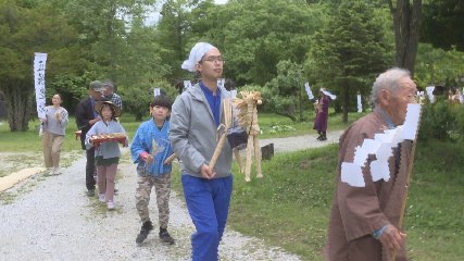 季節ごとの伝統行事を再現している遠野ふるさと村で今週日曜日(2日)「馬っこつなぎ」が行われました。「馬っこつなぎ」は田んぼの神様を迎えて豊作を祈願するもので、神様が田植えの状態を見定めてくれると言い伝えられています。この日は県内外からおよそ30人が参加し、一部の参加者はわら馬作り体験をしたりのぼり旗に願いを書いたりと準備していました。曲り家の屋根に魔除けとしてヨモギとショウブが飾られたあと神事が行われ、まぶりっと衆早池峰の会の佐々木義夫会長が馬っこつなぎについて説明しました。そして、まぶりっと衆を先頭にわら馬やお地蔵様に供える団子などを持った参加者たちが、列を作って田んぼに向かいました。わら馬のうち幣束をつけたものは天からの使いの馬で、幣束をつけないものは荷物を載せる役割があるということです。参加者たちはもち米「ひめのもち」の苗が植えられたばかりの田んぼに到着すると、水口付近にわら馬を置き豊作を祈っていました。馬っこつなぎのあとは、ふるさと村で収穫されたもち米で杵と臼を使った昔ながらの餅つき体験が行われました。餅には、邪気を払い健康にも良いとされるヨモギが加えられ、参加者たちはつきたての柔らかいよもぎ餅をおいしそうにほおばっていました。Copyright(C) TonoCableTelevision. All rights reserved.
