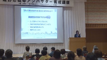 「健幸アンバサダー」を養成する講座がきょうあえりあ遠野で開かれました。この講座は自分の身近な人たちに健康づくりの大切さを伝える健幸アンバサダーについて学んでもらおうと、遠野市とスマートウエルネスコミュニティ協議会が共同で開催しました。主催者を代表して多田市長は「きょうの講座をきっかけに家族や友人に正しい健康情報を広めていただき、元気で明るいまちを目指しましょう」と、あいさつしました。講座ではタニタヘルスリンクの橘小春さんが、日頃の食生活や運動習慣が体におよぼす影響について伝えていました。また、つくばウエルネスリサーチの鶴園卓也さんは筋肉の減少を意味するサルコペニアの危険性や、簡単にできる筋力トレーニングの方法などを説明しました。なお、きょうの養成講座には122人が参加し、終了後には健幸アンバサダーの使命や役割を学んだ受講者たちに認定証が渡されました。Copyright(C) TonoCableTelevision. All rights reserved.